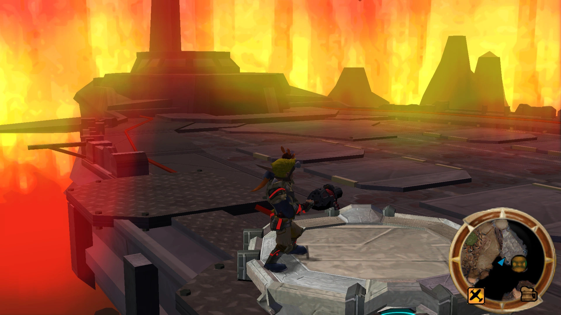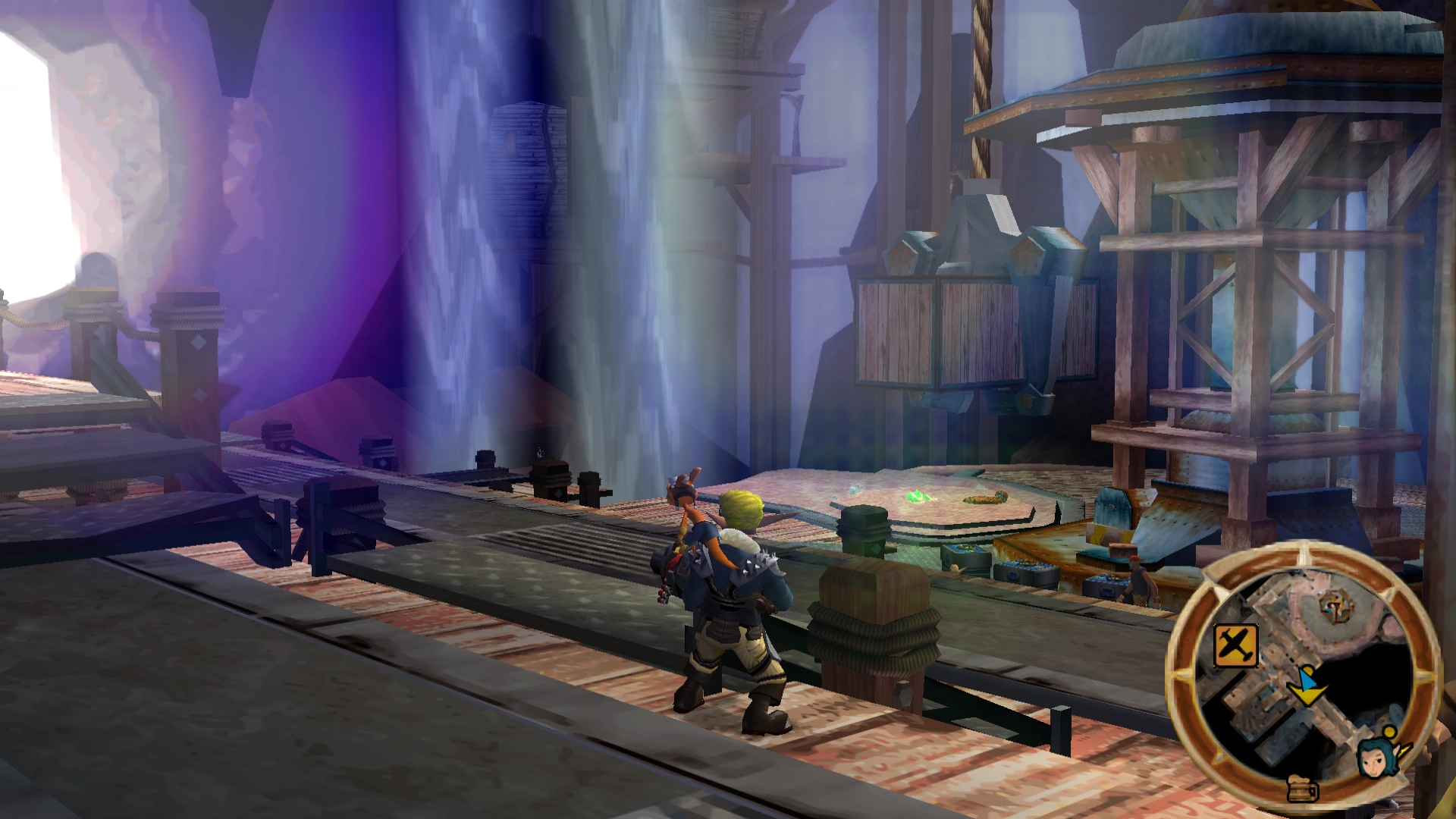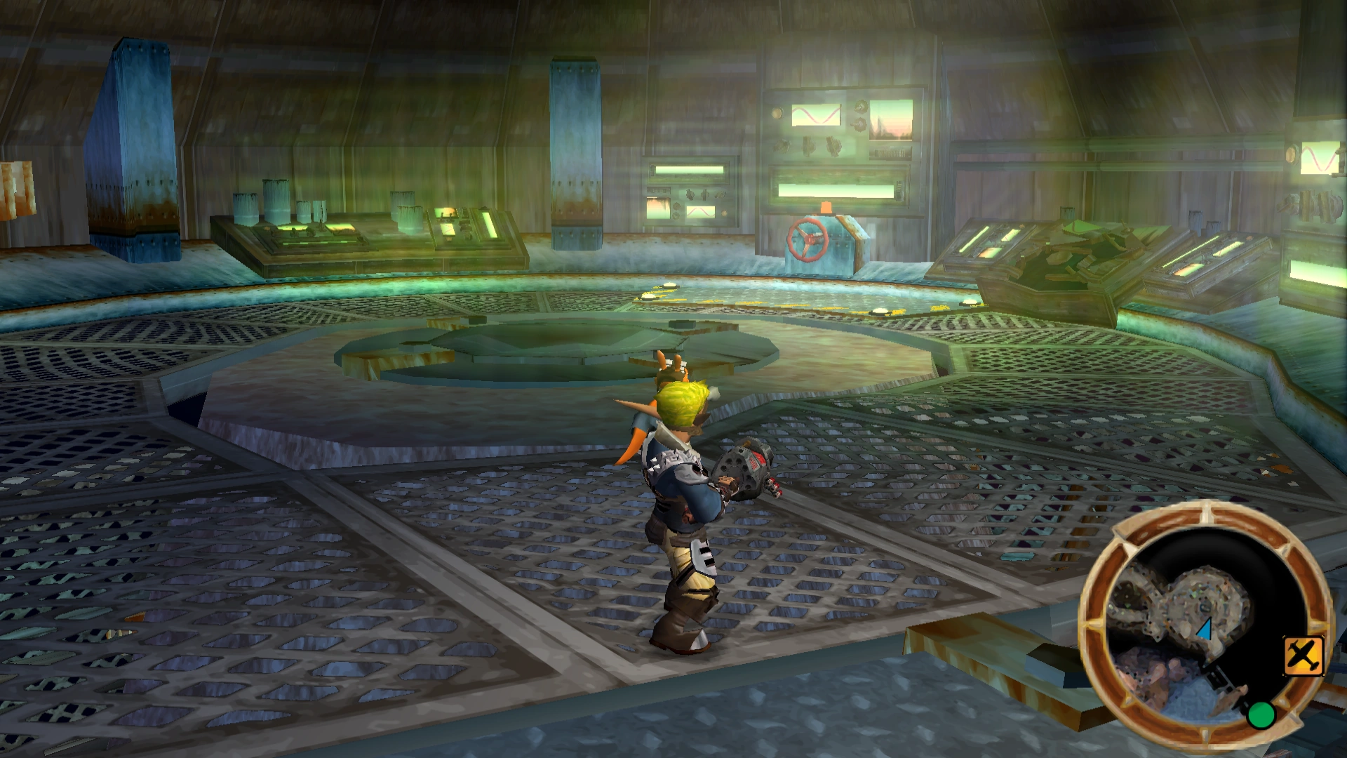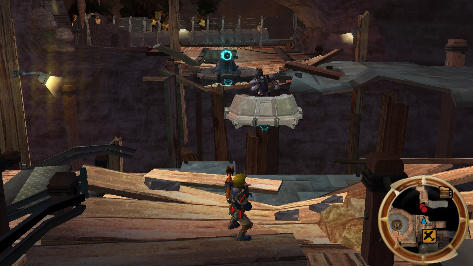 To the north of the main square is a small room with two large metal platforms, one of which rapidly moves up and down. During the siege these two pieces of machinery were completely destroyed, and the area was instead used to access an aeropult that would launch Jak toward the Aeropan dropship.