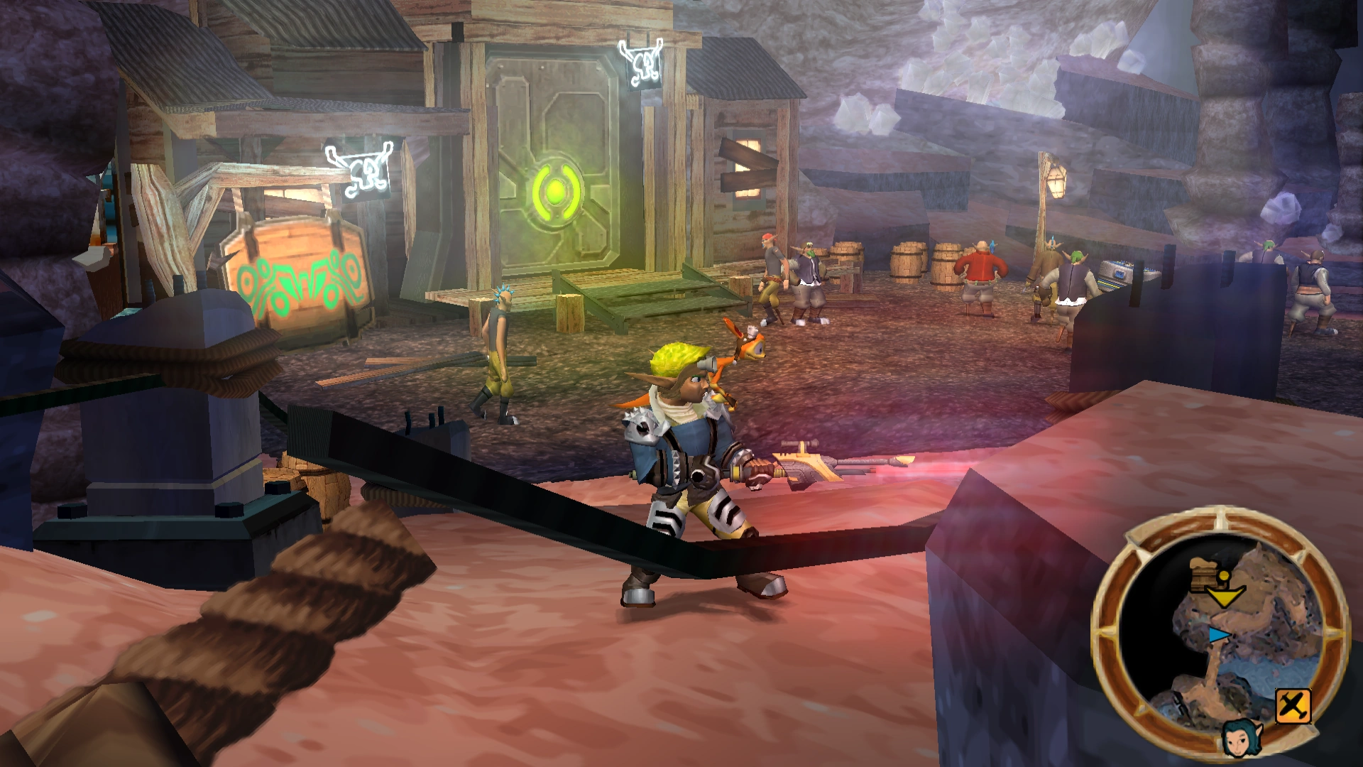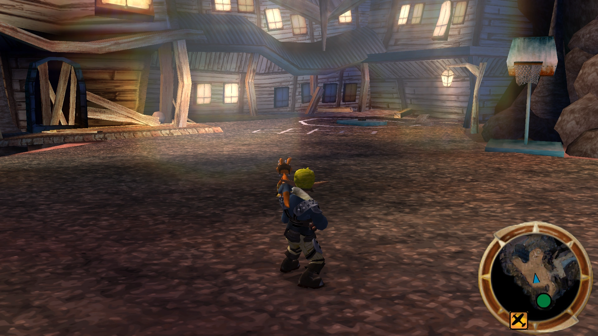 To the north east of the main square are a few wooden bridges that lead toward Barter's tavern. During the siege, all of the bridges were destroyed, requiring Jak to traverse various gaps throughout the town with floating platforms. However, the bridge leading to the tavern formerly crossed over a stream, thus Jak navigated the stream instead of a platform, using the eco shield power. Notably, this stream led Jak around the back toward the tavern, whereas the bridges lead to the front.