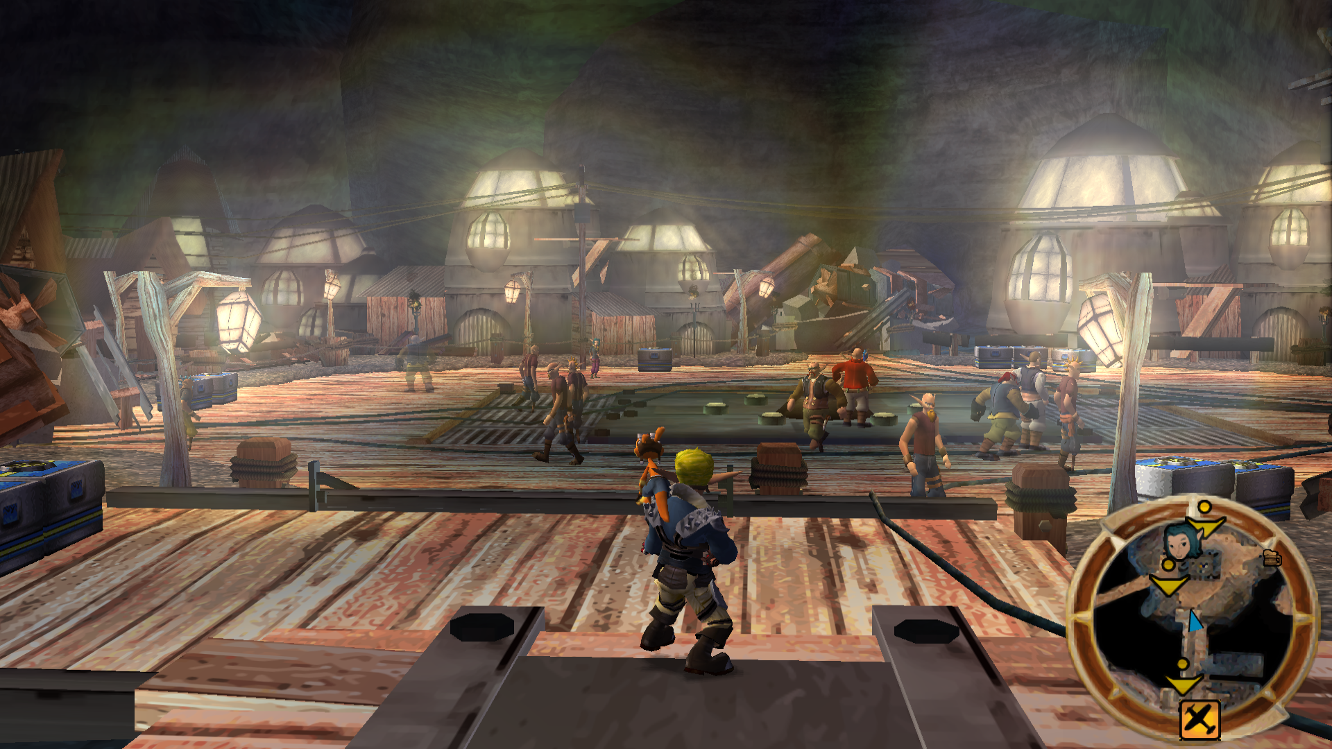 Following the hangar is a short introductory area, with the loading docks and a large crane to the left, and large shipping containers to the right. Ahead of this is the main square which mainly consists of huts, but also includes access points to other areas in the city. Placed in the center of this area have been two large golden statues, the first resembling Phoenix, and the second one resembling Jak and Daxter (replacing the former after its destruction).