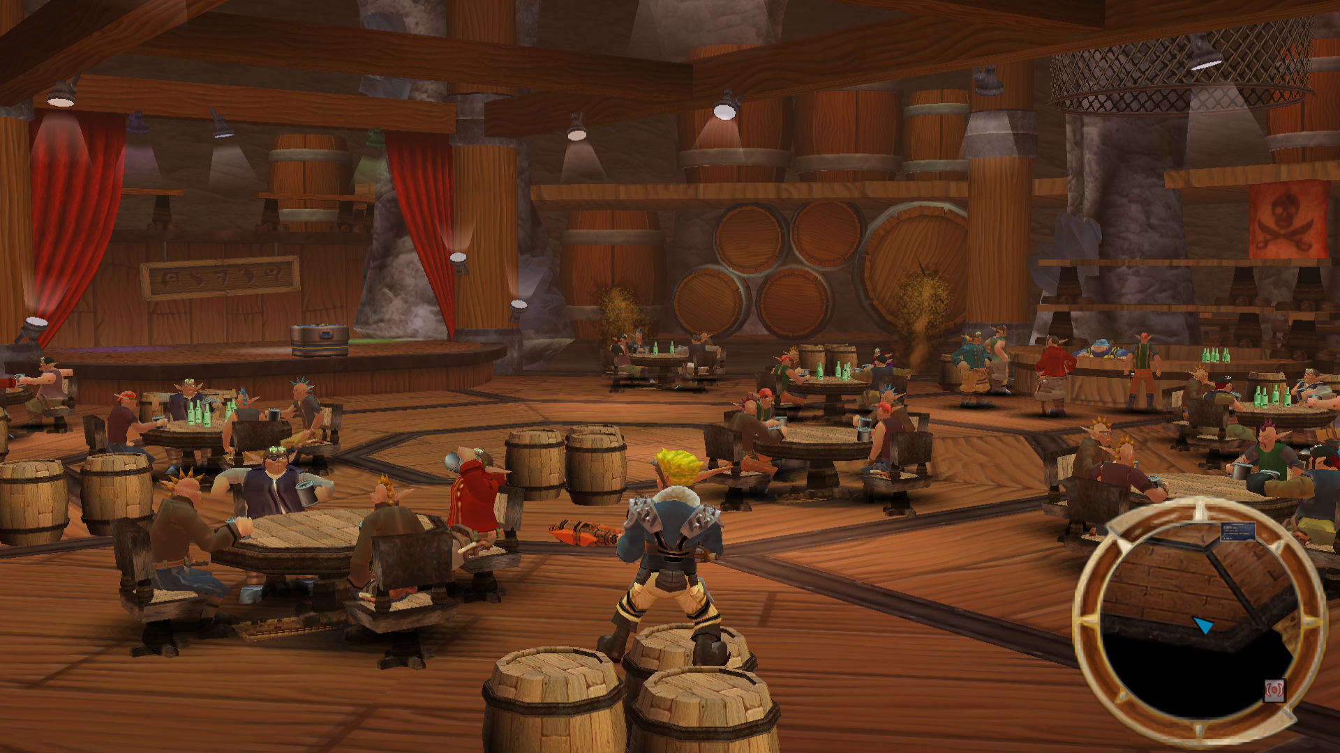The tavern itself is considerably small, with a service bar to the right of the entrance, and a large stage opposite of the entrance. In between are several small round tables with four chairs. Other bar decor includes neon signs, pirate flags, and large wooden kegs, some of which pour endless amounts of beer into a small beer moat surrounding all but the entire interior. There is also a small VIP dining area on the opposite side of the moat, though this is never seen to be in use. One other particular characteristic of the bar is the revocation of firearms, leaving Jak with nothing but a melee club in the Gunstaff.