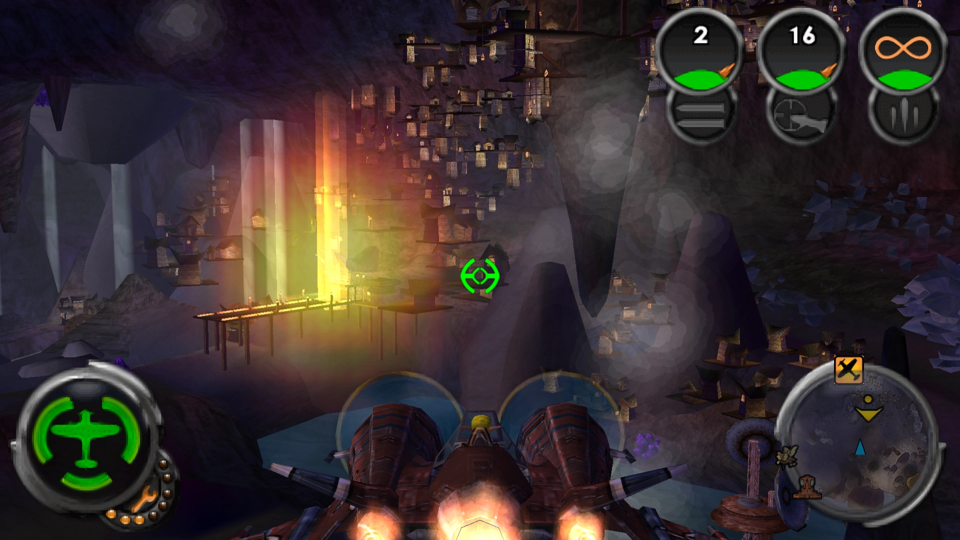 During the first mission, however, the moving platform could be slowed down enough with eco reflexes to reach a higher cave level, notable for its platforming challenges. Firstly there are a series of extremely sensitive teeter-totter platforms, which may sometimes require the deployment of eco reflexes. Between these platforms are more rapidly-moving platforms like those found in the north east side of town.