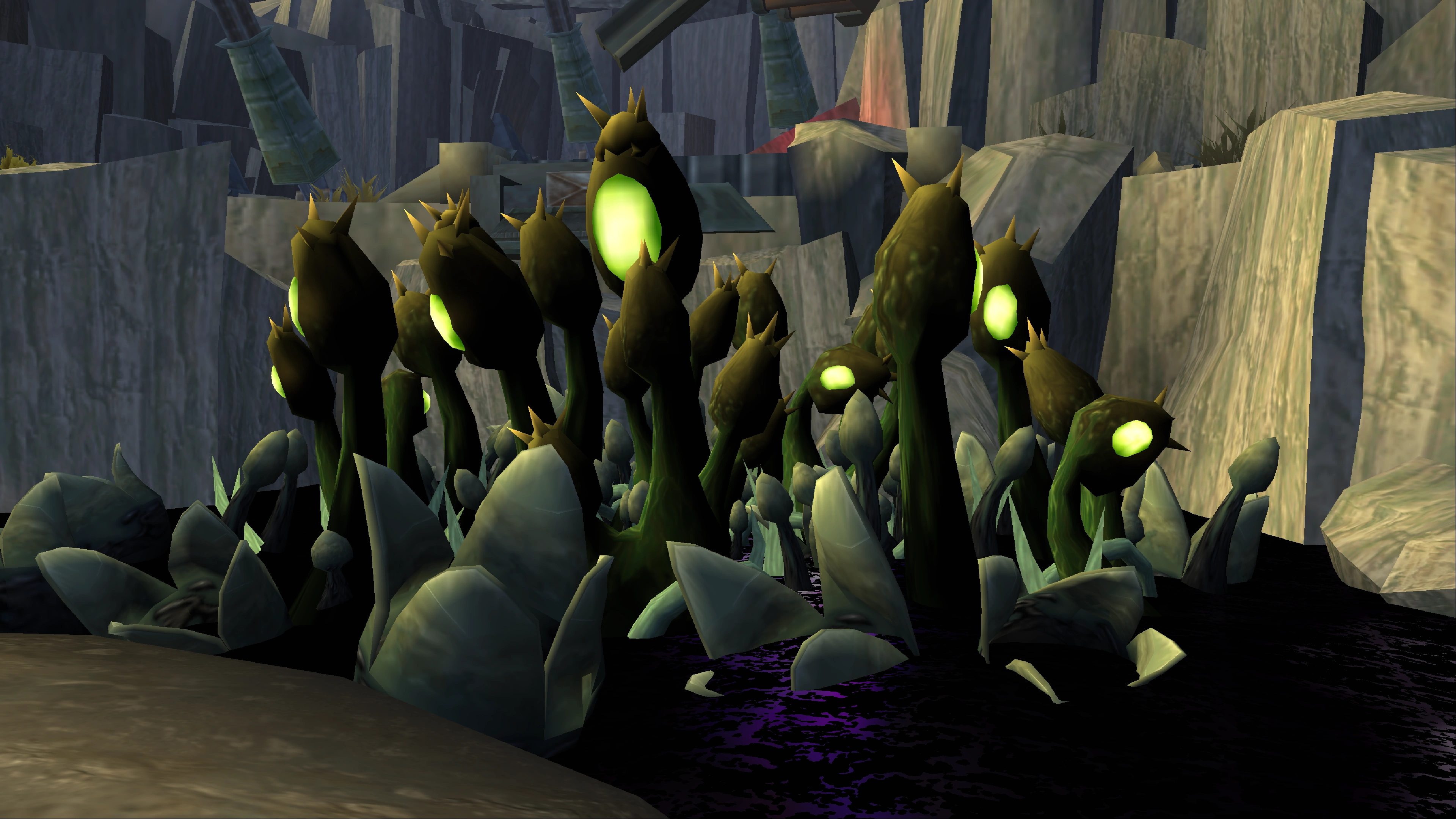 Metal Head city, during Jak 3, which was originally a Gardens and Bazaar sector in Haven City, became a hazardous area with terrain and flora similar to the Metal Head nest with large organic barriers and walls. The ground was segmented with tubular devices emitting a neon green gas with large pods, dark eco colored vines and roots, with various pits and eggs growing near every corner. Between these segmented sidewalks were rivers of acidic sludge which would result in death if one were to fall into it. The Metal Head tower grew at the end of one of these sludge-filled rivers, which was very similar to the Metal Head Nest seen in Jak II, but had a more dead, petrified, rocky appearance, opposed to organic, possibly attributed to the recent infestation of the Dark Makers.
