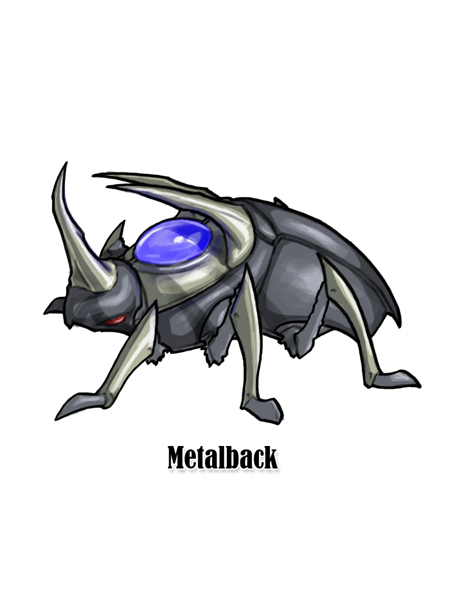 They have a similar appearance to a common beetle, with four legs (and two frontal appendages) and a hard-shell thorax. Typical to metal heads, the metal back has a light silver/gold sheen to its metallic armor, with two beady, yellow eyes and a dark blue under skin.