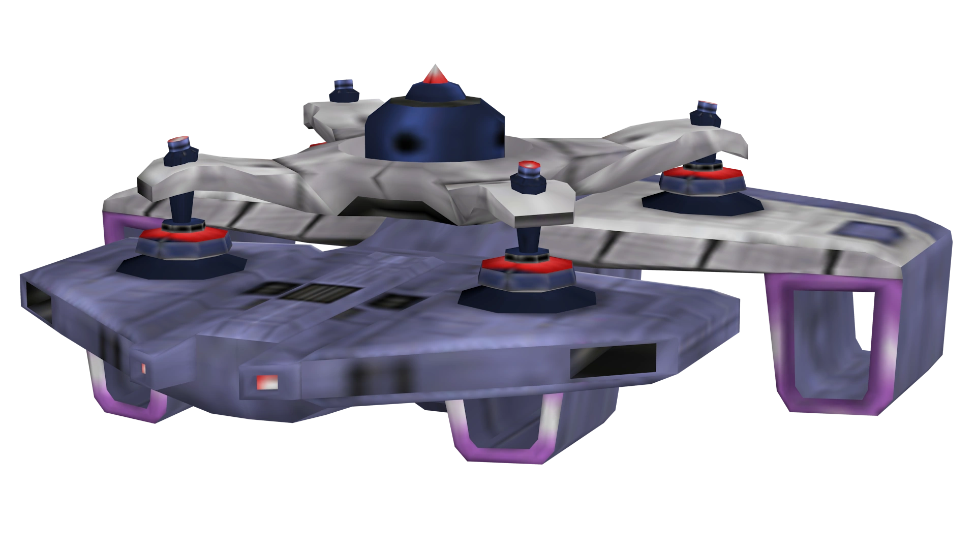 The tender does however retain the same color scheme as the gunships, having a mostly amethyst surface with silver back-most platforms. The electrode/quad-pod device on top is mostly silver, with red and blue trim.