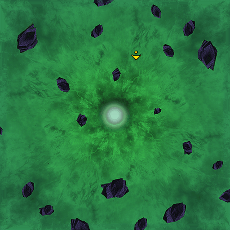 An eerie voice will then ask you to find his lost treasure, and you must hunt down one of five or six blinking green dots. As you approach a dot, a sonar will sound, and will grow faster in frequency as you approach the target. Some of them will disappear, however, and it is your job to find the one that doesn't. Once you find the right one, you will see a wreckage of a Sky Raider surrounded by a green cloud. Simply fly up to it to receive your reward.
